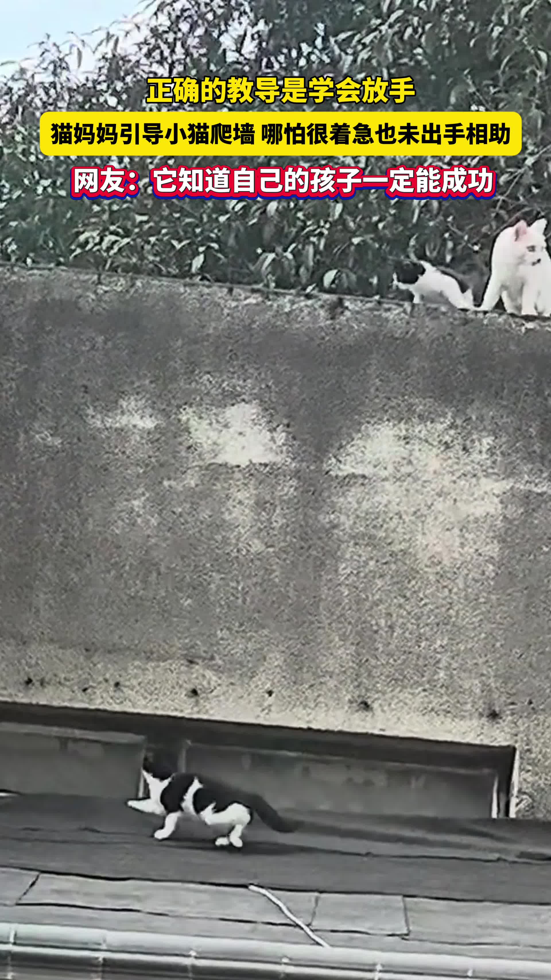 正确的教导是学会放手!猫妈妈引导小猫爬墙,哪怕很着急,也未出手相助!网友:它知道自己的孩子一定能成功